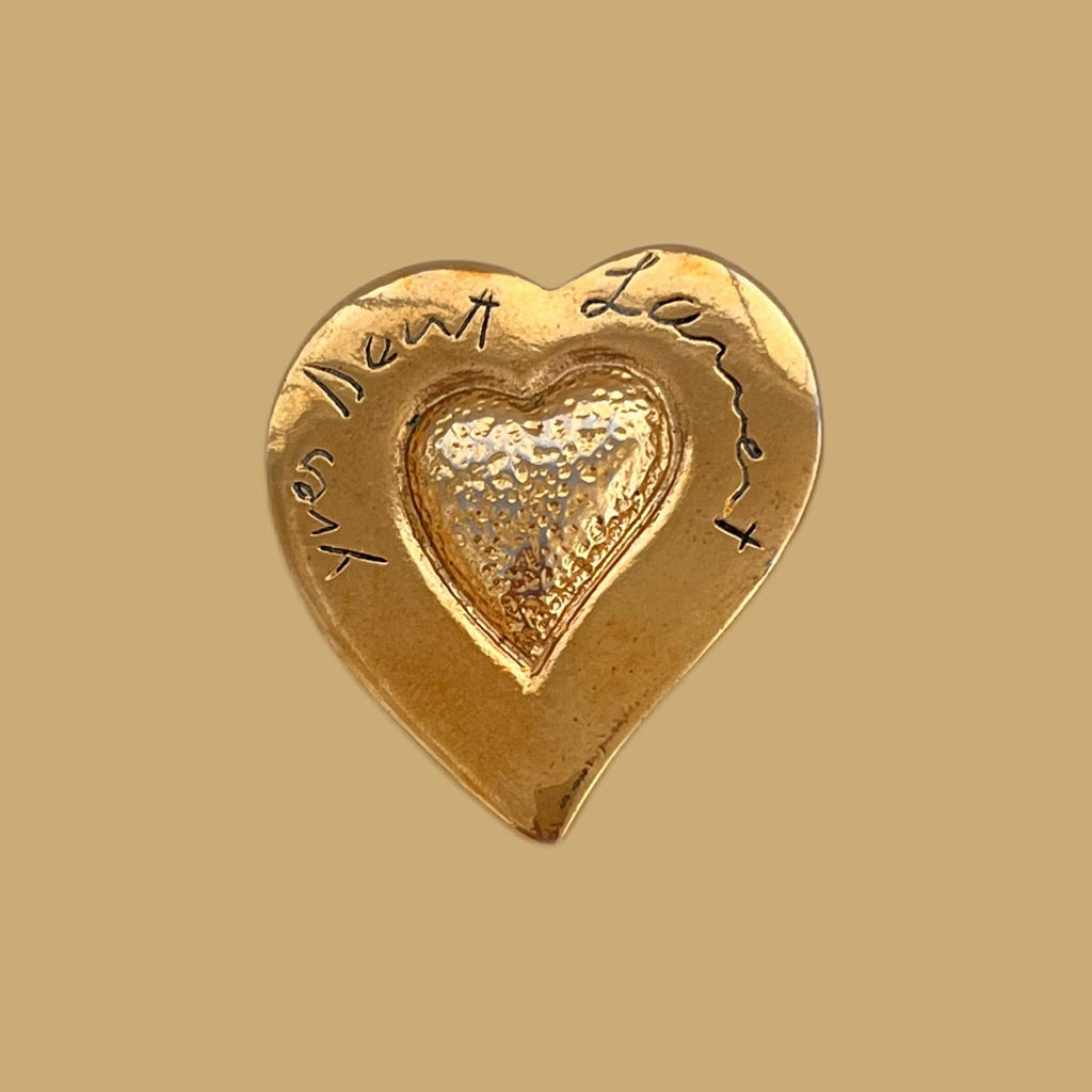 Cette broche en forme de cœur, qui est caractéristique du style de la maison Yves Saint Laurent, est dorée et signée dans son contour. Les deux textures du métal permettent de donner du relief au cœur. Pièces emblématiques des années 90/2000.