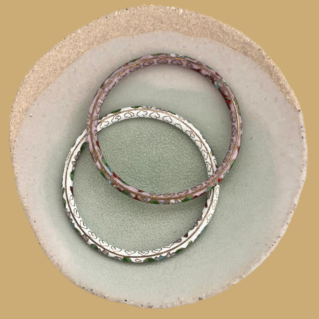 This set of two bangle bracelets is a unique ensemble that combines the elegance of Asian style with the delicacy of cloisonné enamel. This ancient craft technique involves soldering thin metal strips to create patterns, which are then filled with colored enamels to form delicate designs.