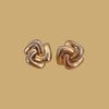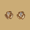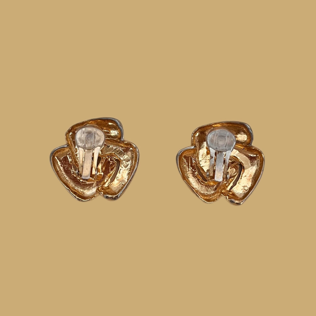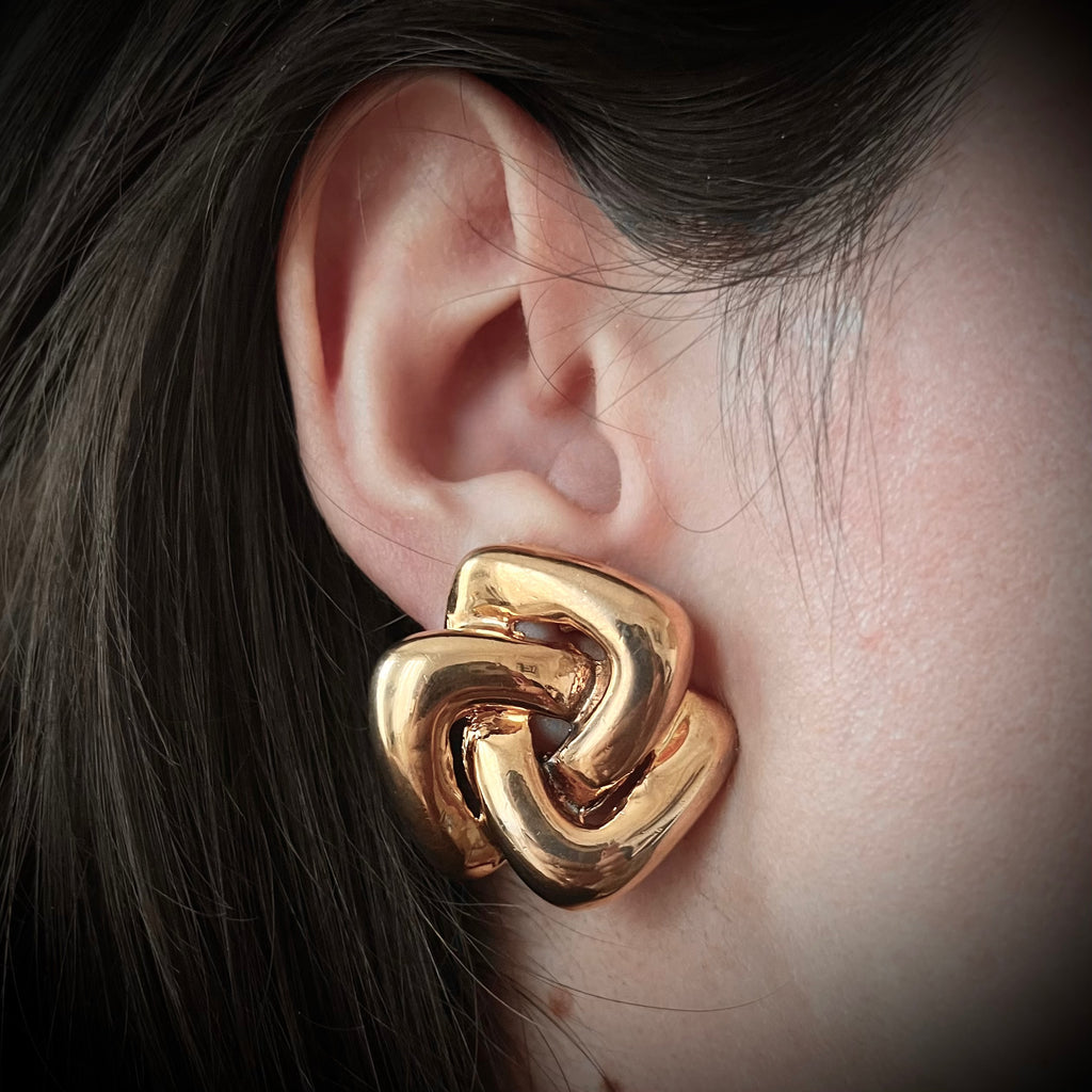 Gold-plated metal clip-on earrings with an intertwined link design. This pair is lightweight and elegant. The patina of the gold plating maximizes its vintage charm.