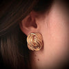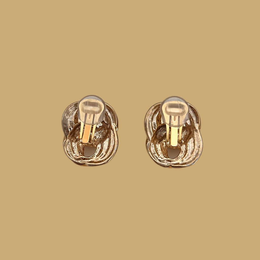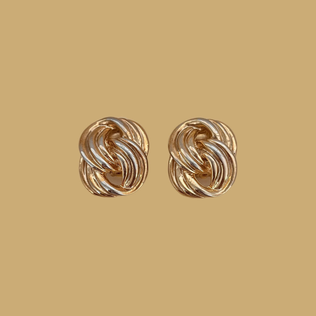 Gold-plated metal clip-on earrings with an interlocking figure-eight link design. Their light patina enhances the jewelry's relief.