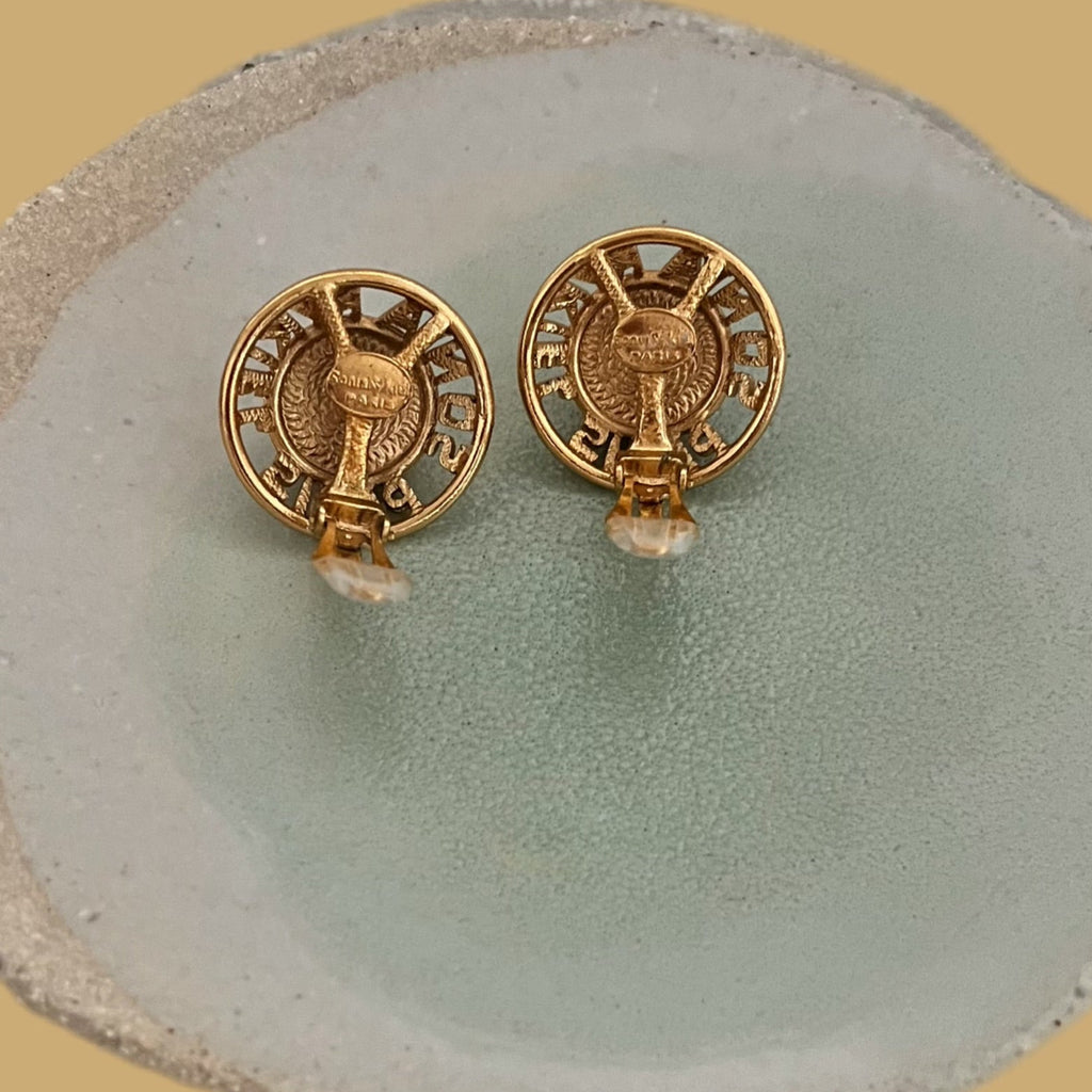 These gold-plated metal Sonia Rykiel clip-on earrings are a true vintage gem, embodying the bold and artistic aesthetic of the Parisian fashion house. They are a perfect example of a chic and sophisticated accessory. At the center, the earring is adorned with a large, pearly white faux pearl, adding a touch of timeless elegance.