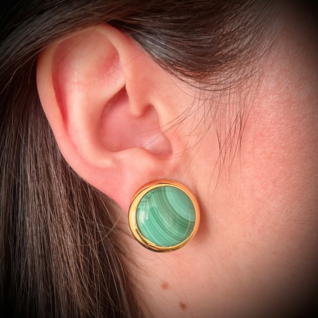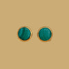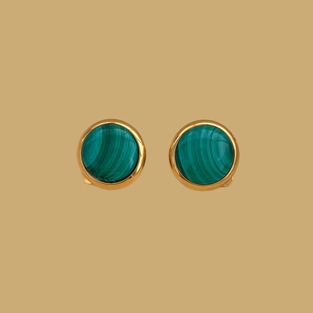 These round ear clips have a clean and sophisticated style, with a deep green stone reminiscent of malachite.