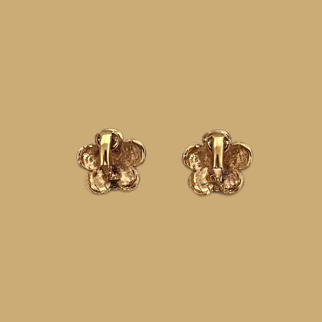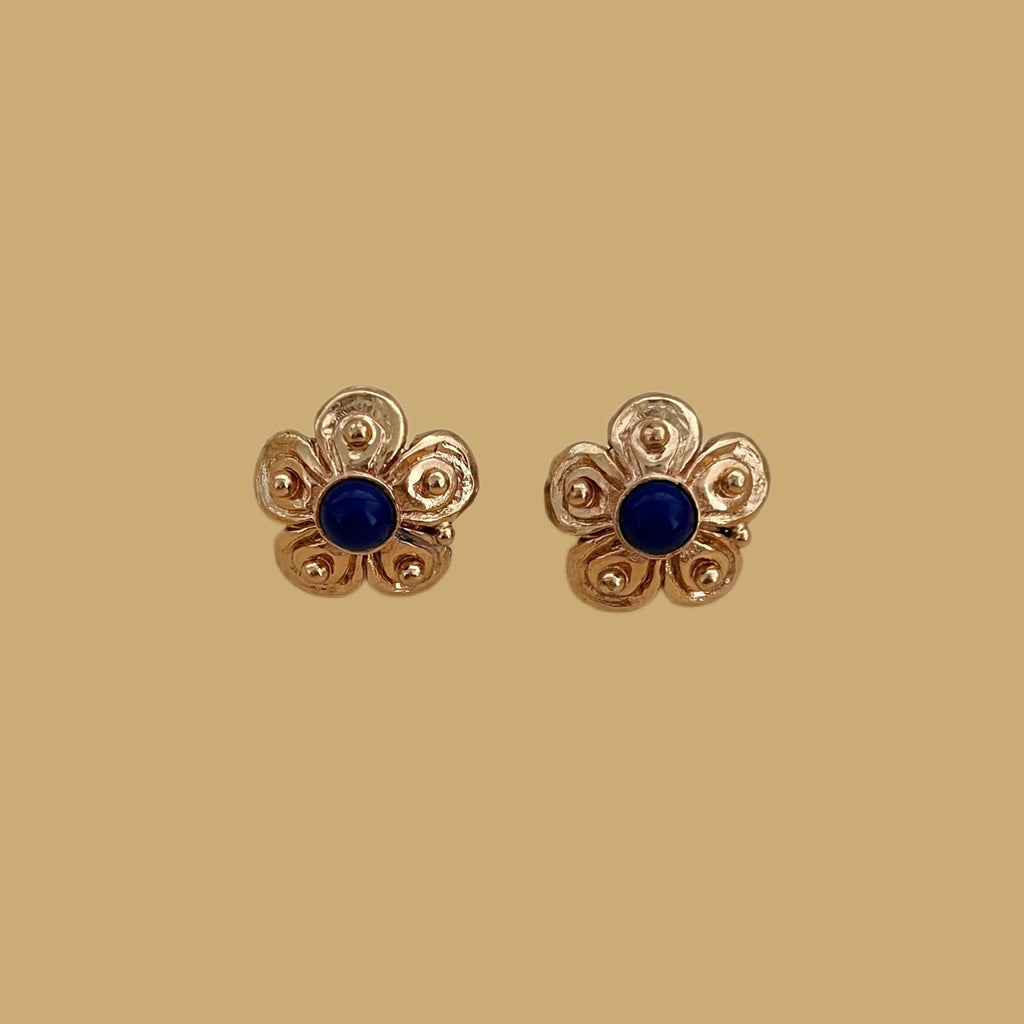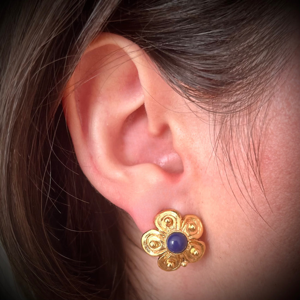 These clip-on earrings feature a stylized five-petaled flower design. The setting is made of gold-plated metal with a patinated finish. Each petal is crafted with a raised spiral motif, creating an impression of movement. A midnight blue stone sits at the center of the flower, contrasting beautifully with the metal. The design of these earrings is both bohemian and vintage, with undeniable charm.