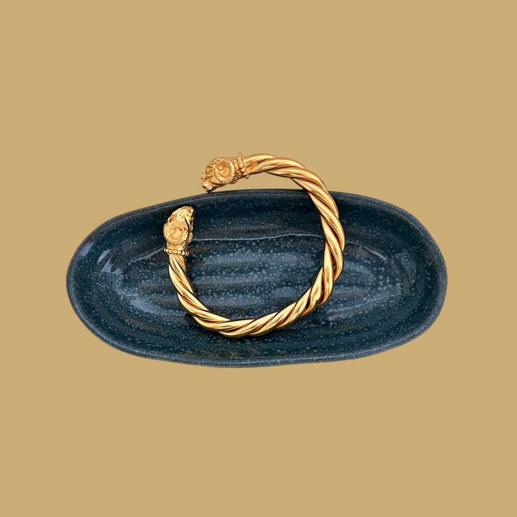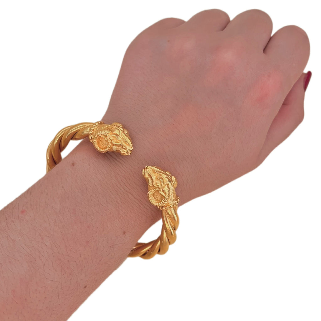 Each end of the bracelet is adorned with a finely detailed ram's head, adding a touch of strength and elegance to the whole.