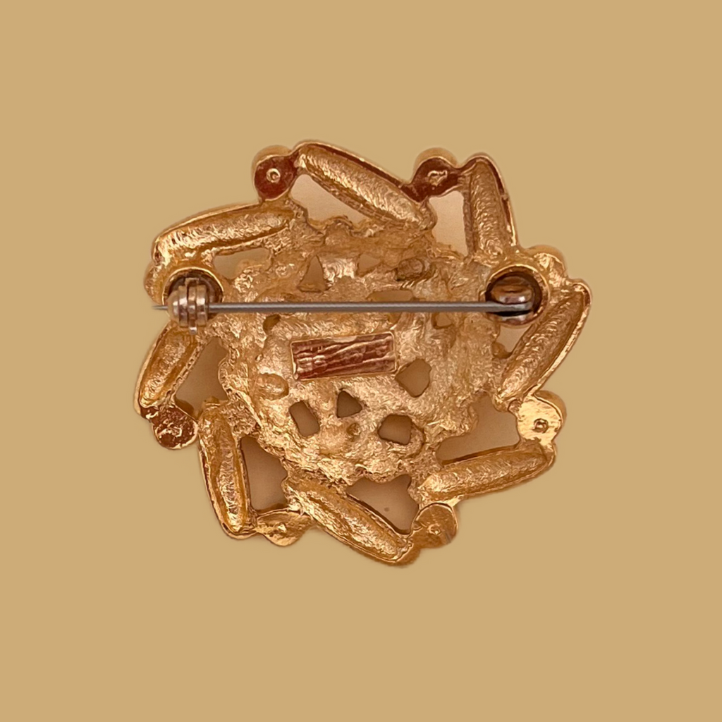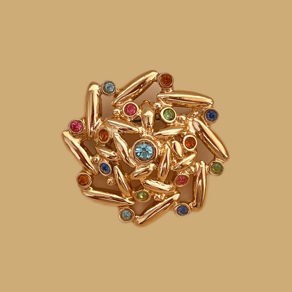 This brooch, featuring pastel glass stones and unpatinated gold plating, will add a touch of color to your outfits and blazers. Give a pop of color to monochrome looks and accessorize your style.