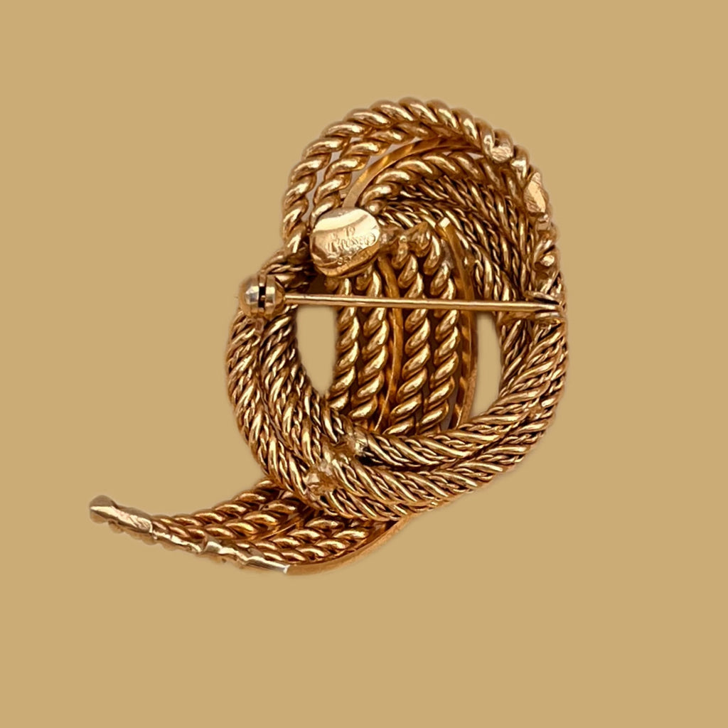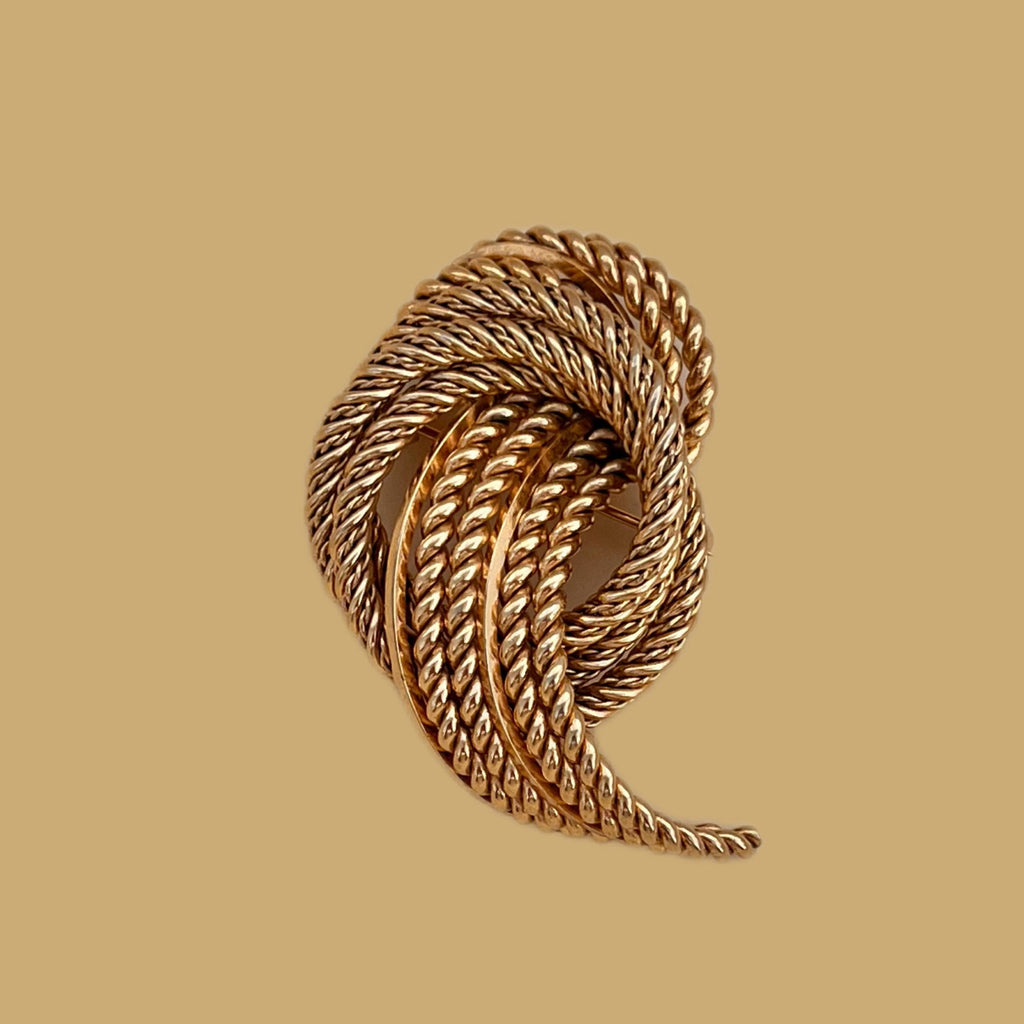 This elegant vintage-style brooch by GROSSE features an abstract, sculptural design. Composed of several twisted metal strands, it evokes braided rope or ears of wheat. In the style of the 60s/70s, it adds sophistication and refinement to any outfit.