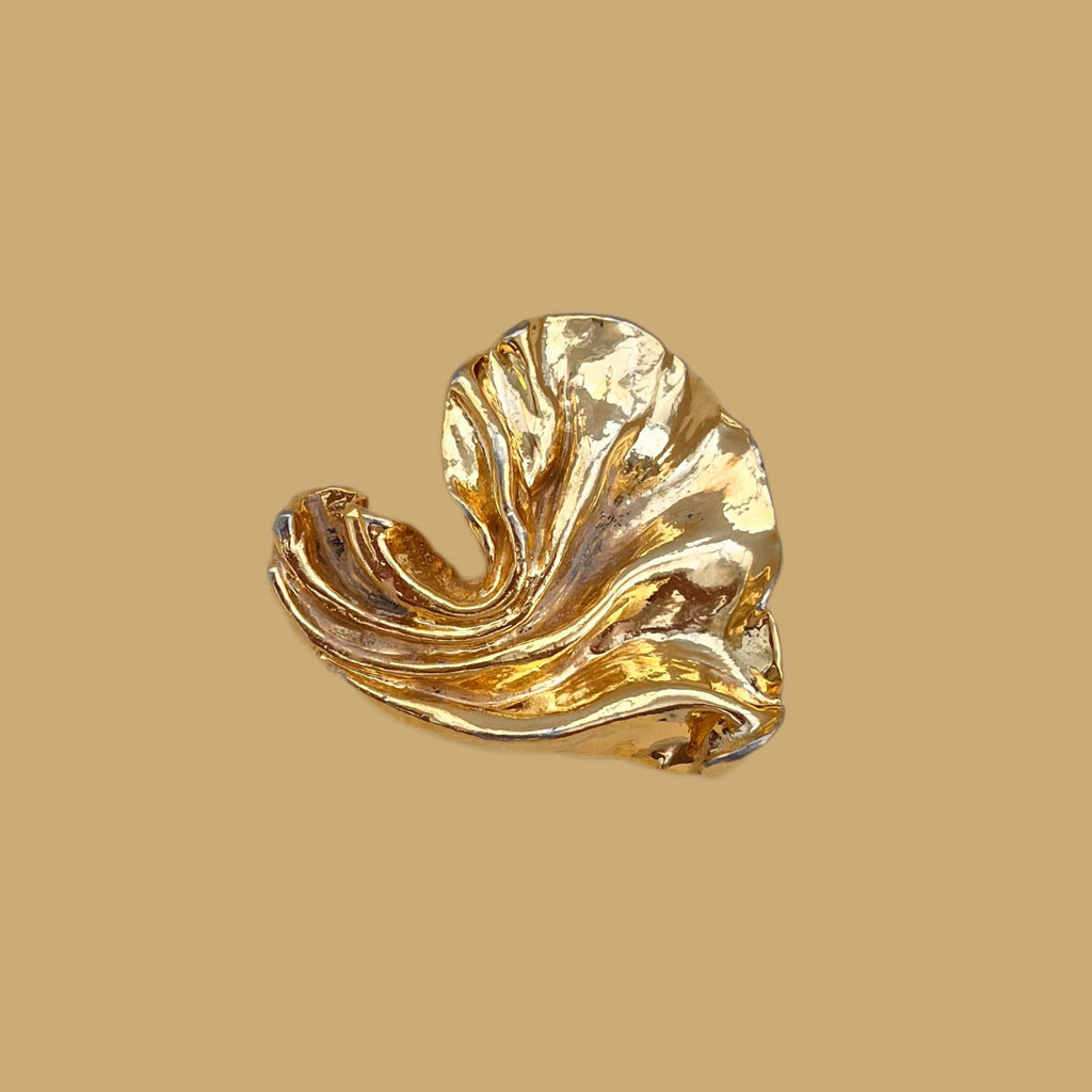 This brooch is asymmetrically shaped and resembles a crumpled leaf; with its gilding and textured surface, it captures the light, and the abstract, organic design gives it a modern and elegant look.