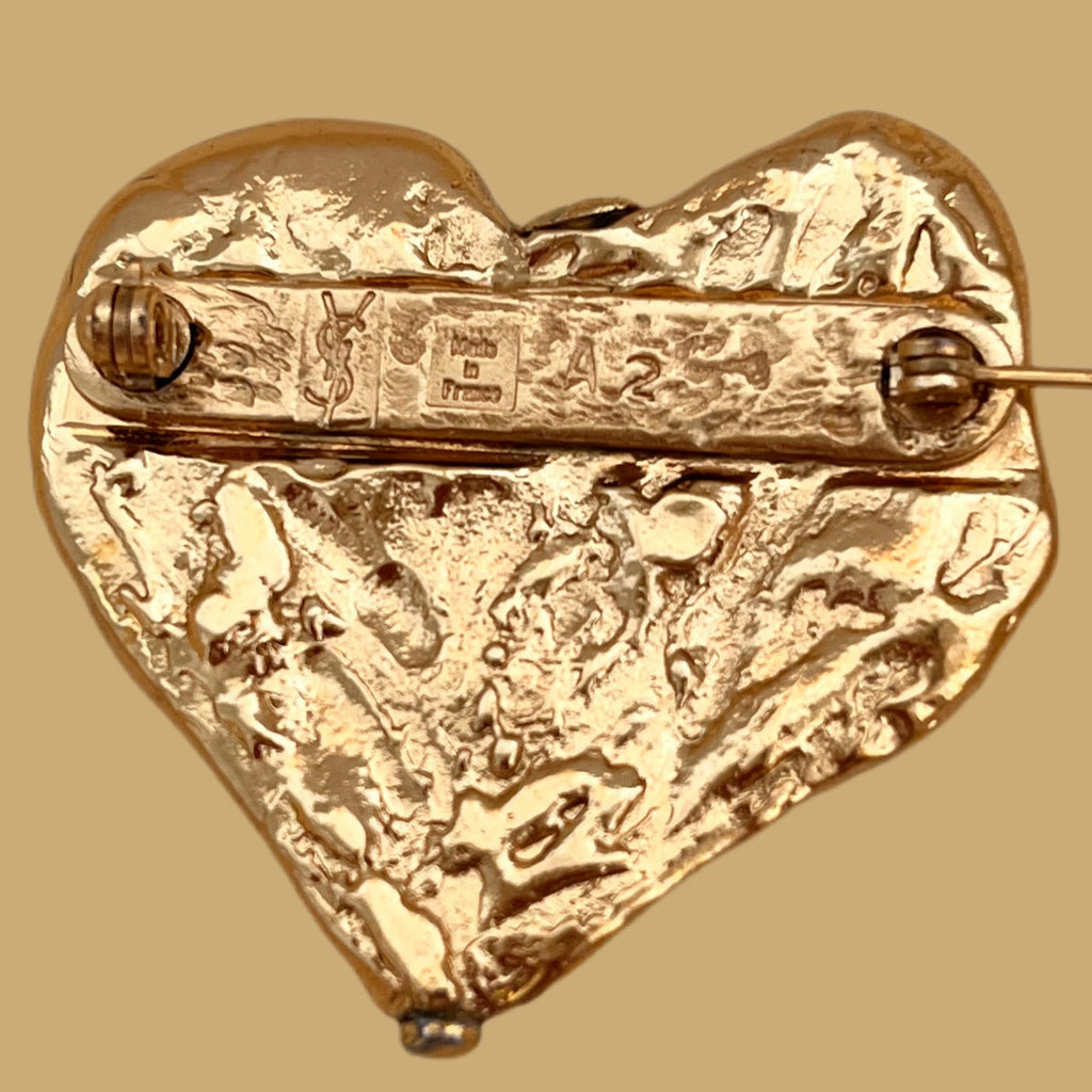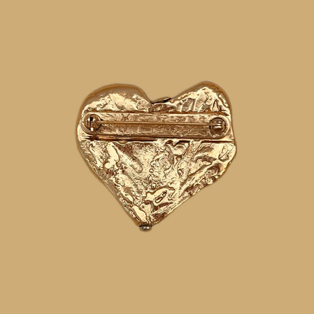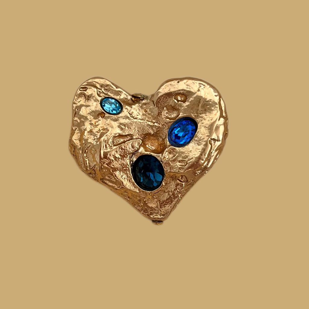 This Yves Saint Laurent heart-shaped brooch in hollow metal is accompanied by three glass cabochons in different shades of blue; its lightness allows it to be easily worn on fine fabrics, and it adds a lot of boldness to French chic.
