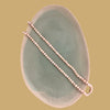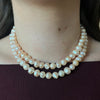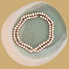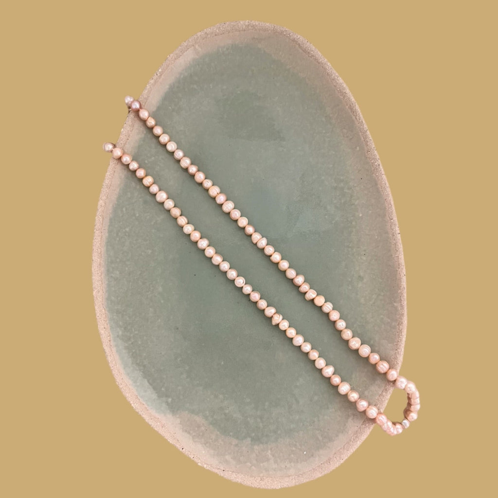 This exquisite necklace is a delicate sautoir, composed of a long strand of freshwater pearls that elegantly coil around itself. The slightly irregularly shaped, small pearls display a very soft and natural pink and peach hue, lending the necklace an organic and feminine charm. The necklace's generous length allows it to be worn as a single or double strand, creating a classic and refined look. It's a timeless and versatile piece, perfect for adding a touch of understated sophistication to any outfit, from a simple blouse to a cocktail dress.