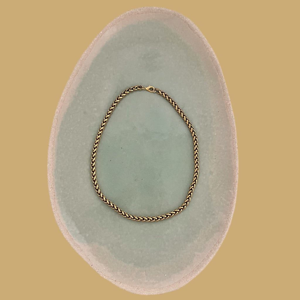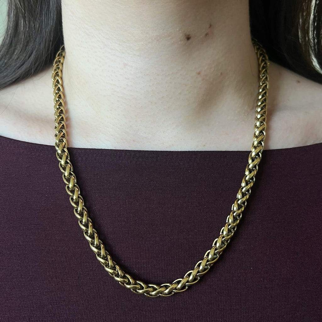This plated metal necklace is characterized by its thick, flexible, rope-like or braided link (often called "rope" or "horse" link). The wires or links are tightly intertwined and twisted, giving the chain a textured appearance and a round, regular shape. Its dense construction lends it a rich luster and substantial presence, evoking a style that is both classic and robust.