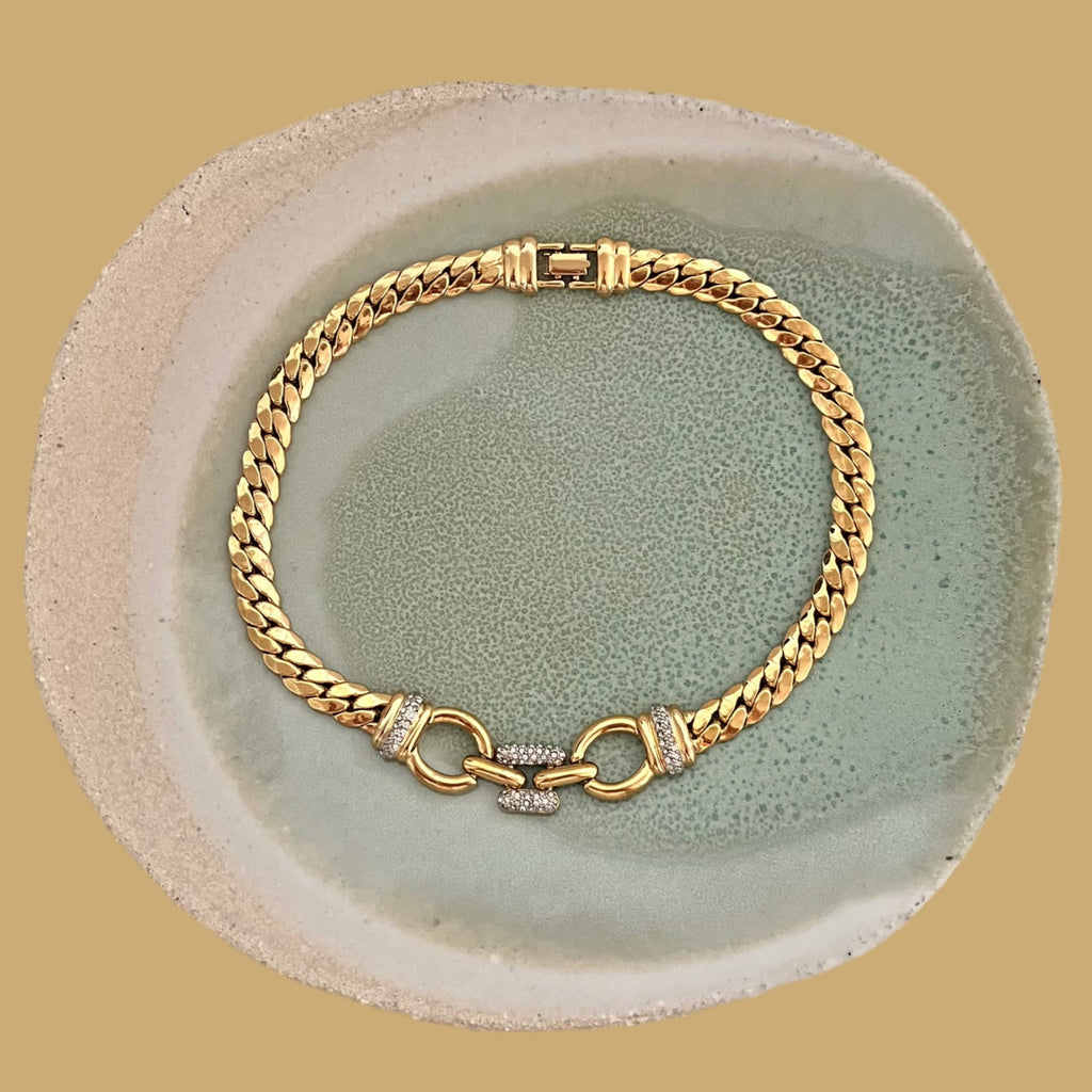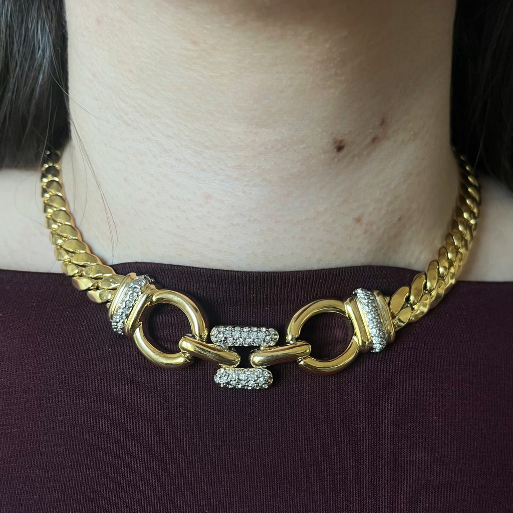 This necklace features a bold, gold-plated metal curb chain that perfectly complements its central clasp, adorned with sparkling rhinestones for a touch of luminous sophistication and a style that is both classic and assertive.
